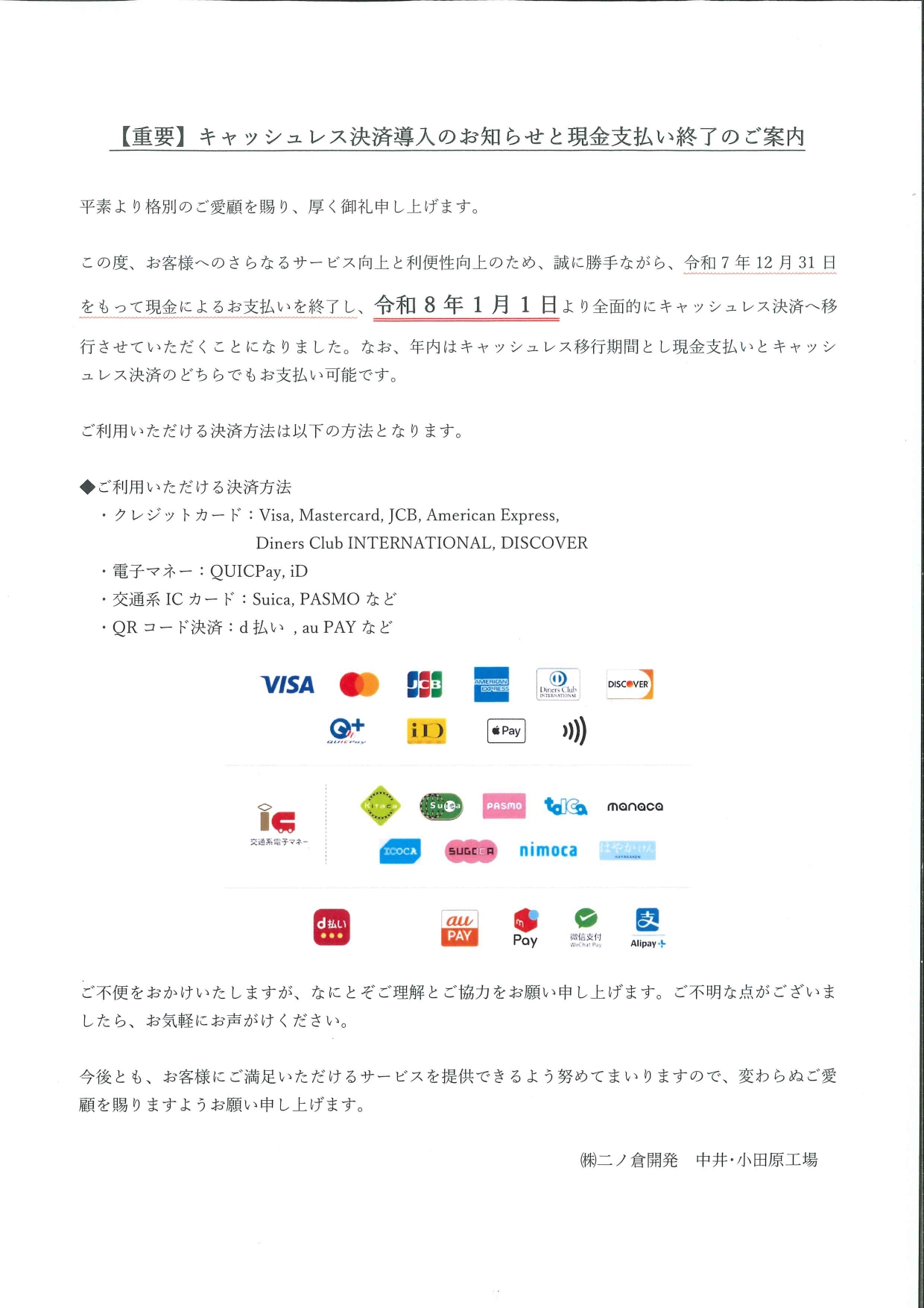 [お知らせ]【重要】中井・小田原工場、窓口での現金支払い終了のお知らせ。2025.09.29